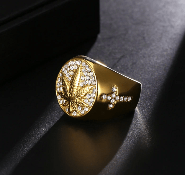 If you're all about that kush life this is the ring for you. The accessory has a detailed marijuana leaf surrounded by rhinestones, perfect for those who are bold enough to wear it. Available in five sizes (8 through 11).