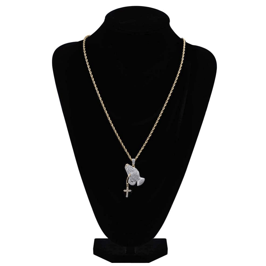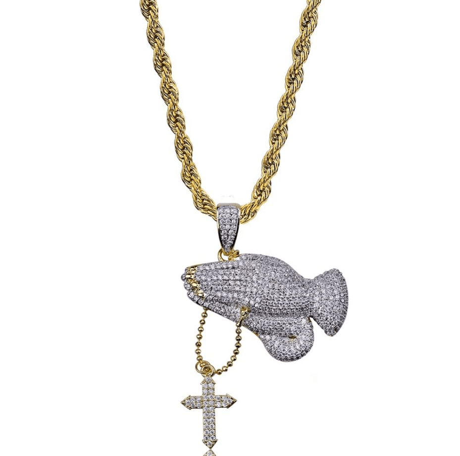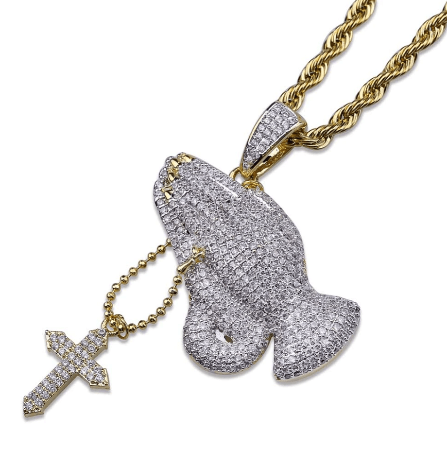 Der Anhänger "Iced Praying Hands" verleiht einem klassischen Stück eine neue Dimension, indem er eine Miniaturkugelkette und ein hängendes Kreuz hinzufügt.