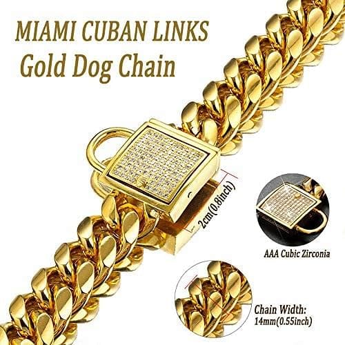 Cuando piensa en joyas de lujo, ¿qué le viene a la mente? ¿Relojes de oro, anillos de diamantes, colgantes de plata? Si los collares para perros de razas grandes no aparecen de inmediato en su cabeza, nos gustaría cambiar eso. En VVS Jewelry, queremos que nuestros perros también se vean geniales. Nuestro collar cubano para perros de oro de 14 mm está hecho de una base de acero inoxidable de grado marino de alta calidad y de primera calidad que cumple con nuestras más altas expectativas de un collar para perros garantizado para durar toda la vida con el cuidado adecuado. Está disponible desde 12 pulgadas hasta 32 pulgadas que seguramente puede adaptarse a razas medianas a grandes.