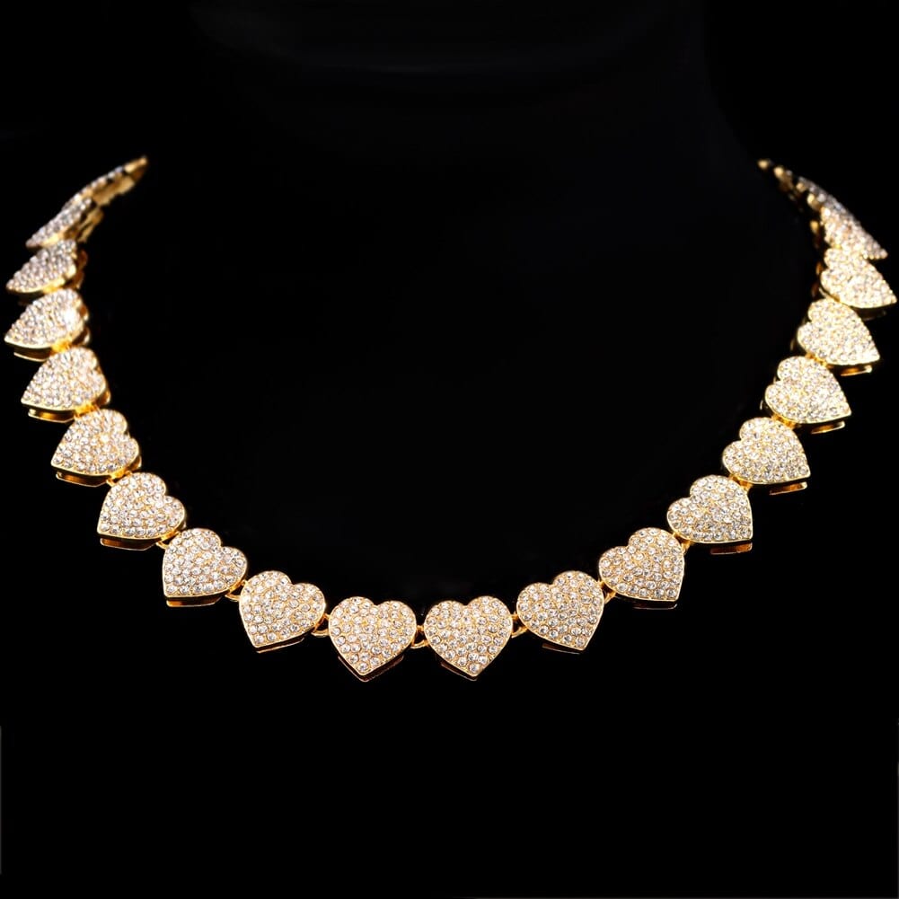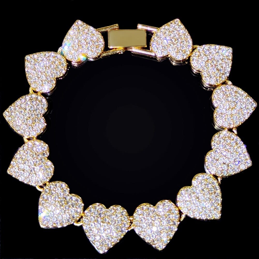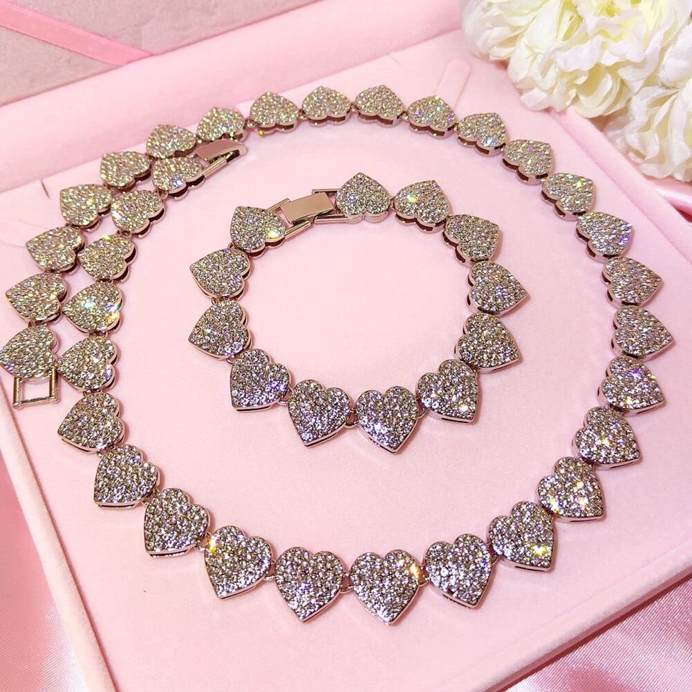 This iced out tennis chain and bracelet have a heart shape that is unique from the commonly bought pieces of jewelry. Its icey appearance makes it shine, bringing your overall look to another level. It is made of premium metals to make it last a long time and be safe to use.