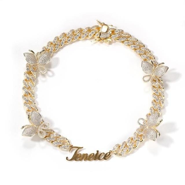 Fall in love with our newest customized trend. Our Customized scripted name Cuban link butterfly chain is the best you should have. It's made out of high-quality 18K Gold plating over brass and cubic zirconia that you would surely love. With a wonderful and just width size of 12mm, what made this piece really unique is you can have the choices for the font so it would bring the vibe to your chosen #ootd.