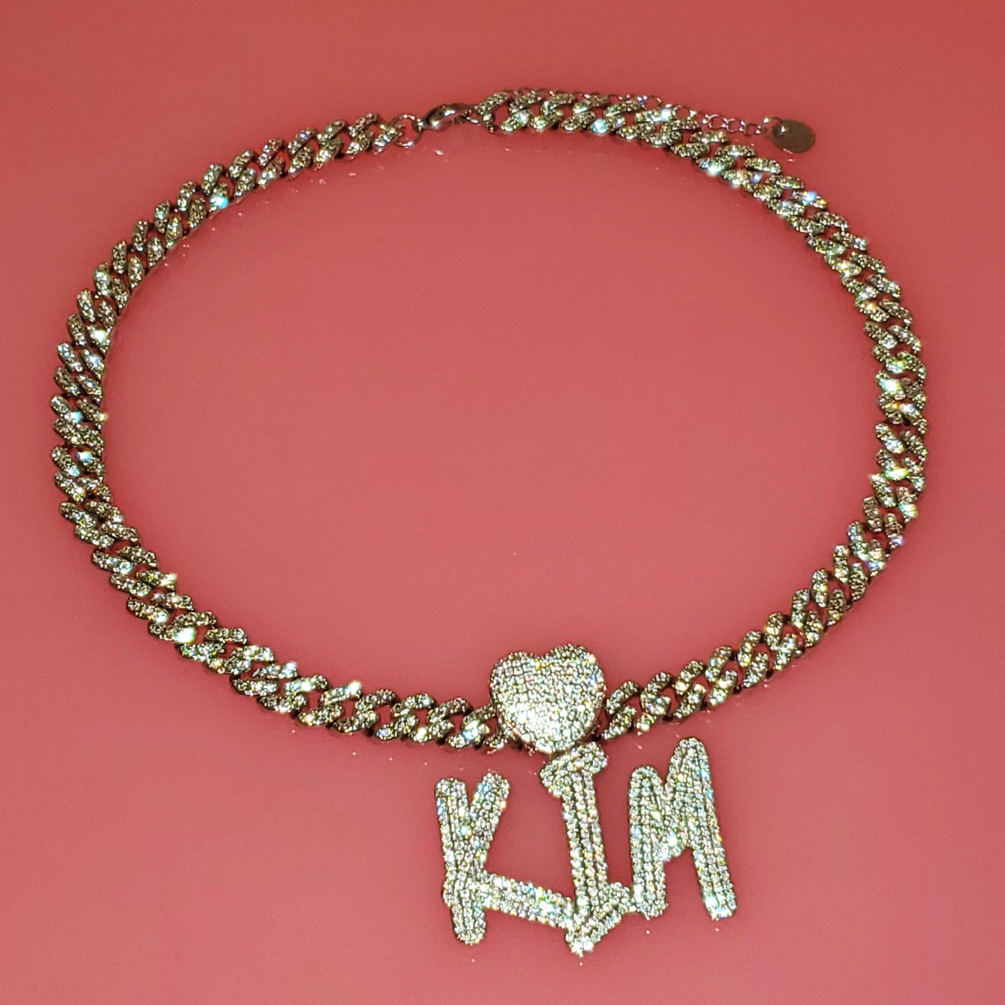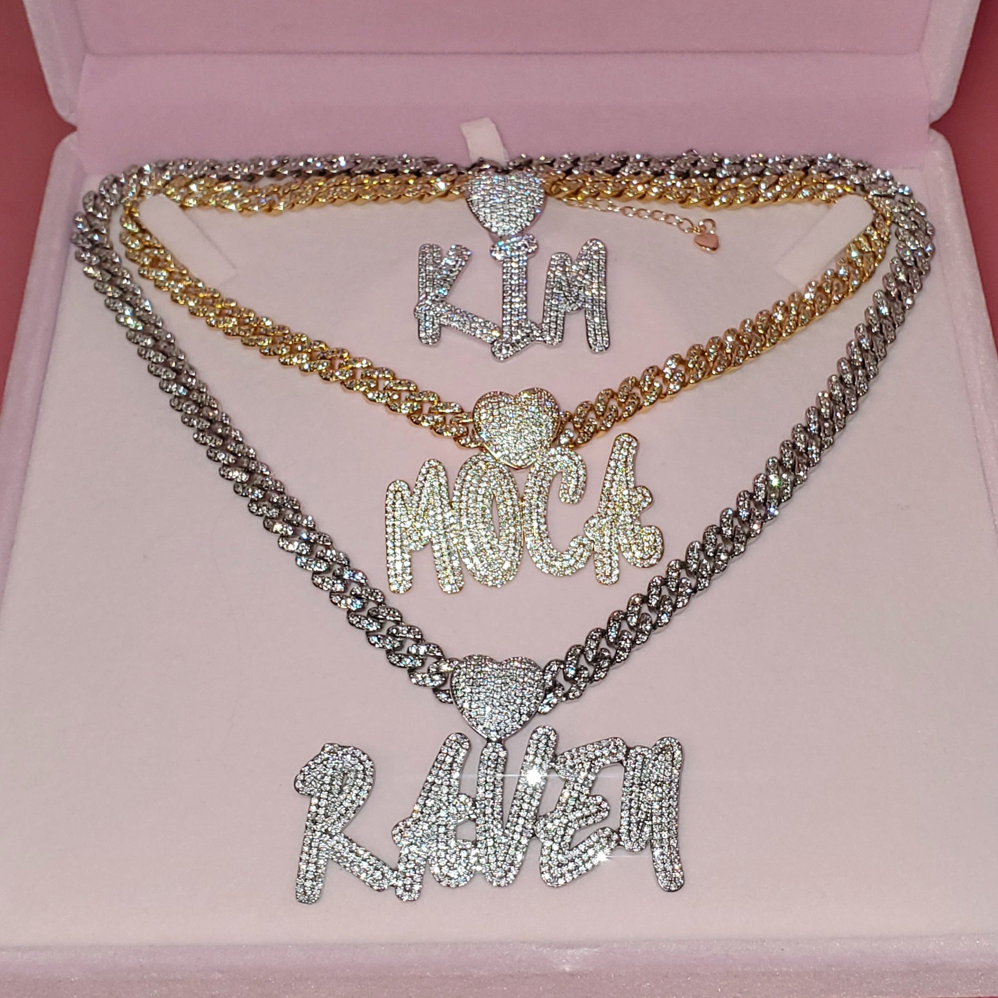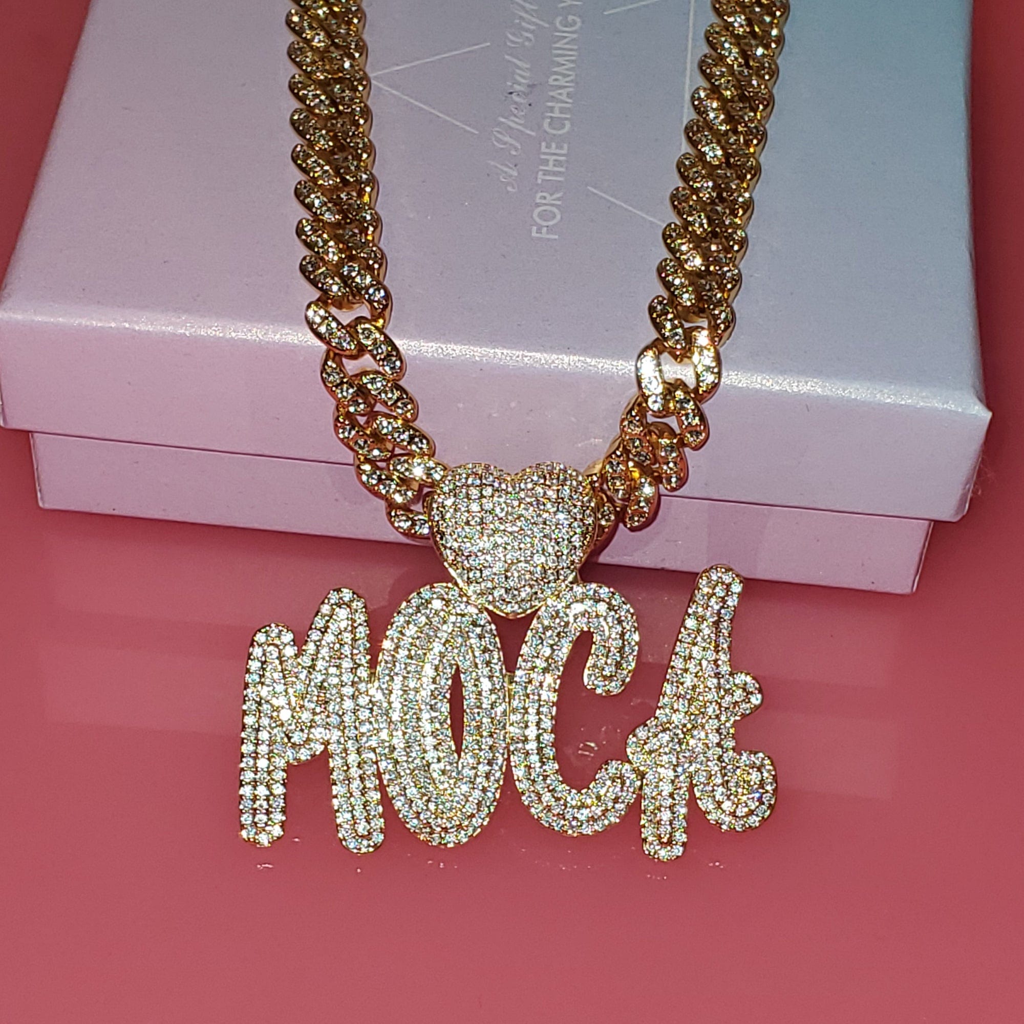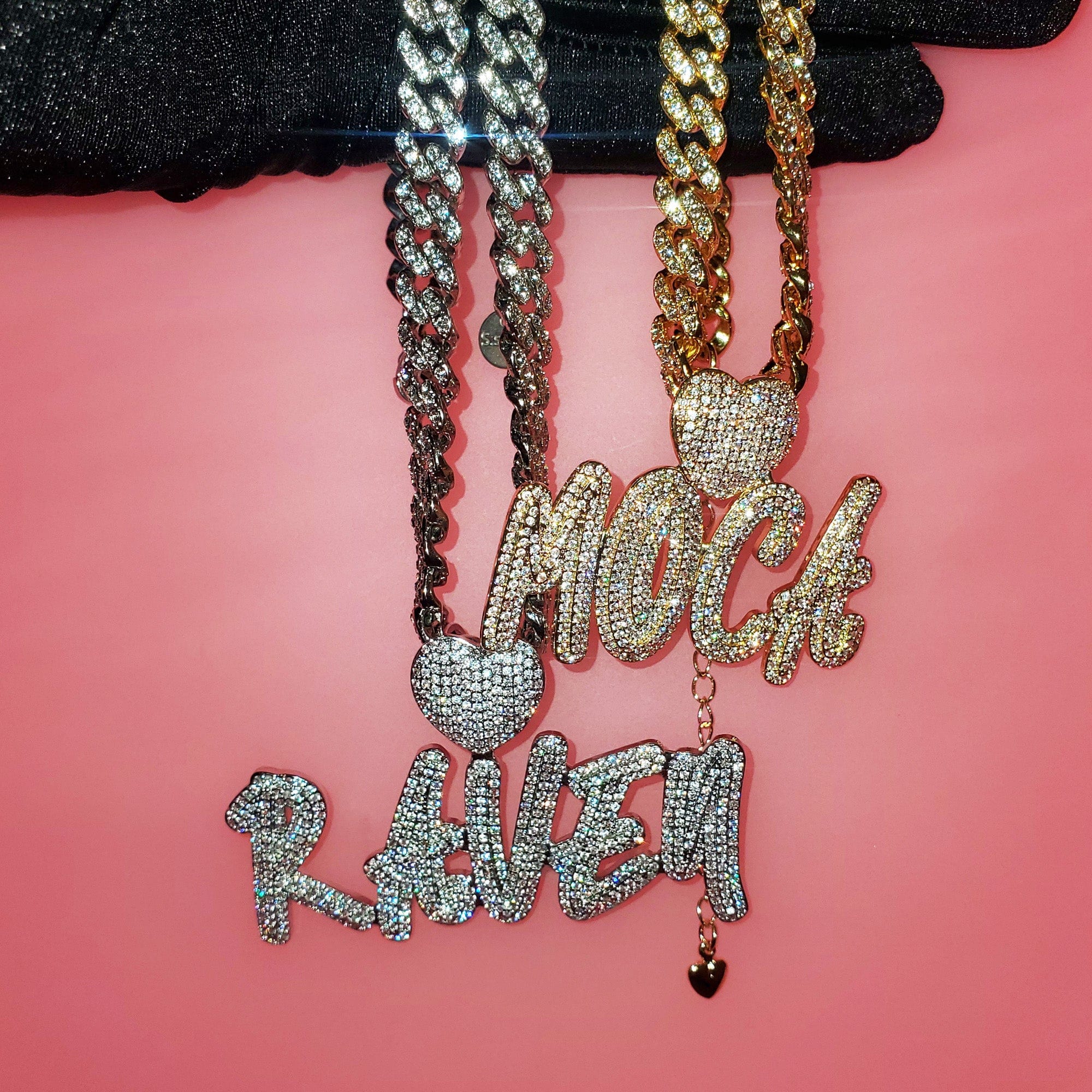 Trendiest dope initial cursive letter pendant topped with an iced-out heart.