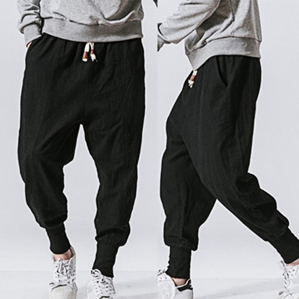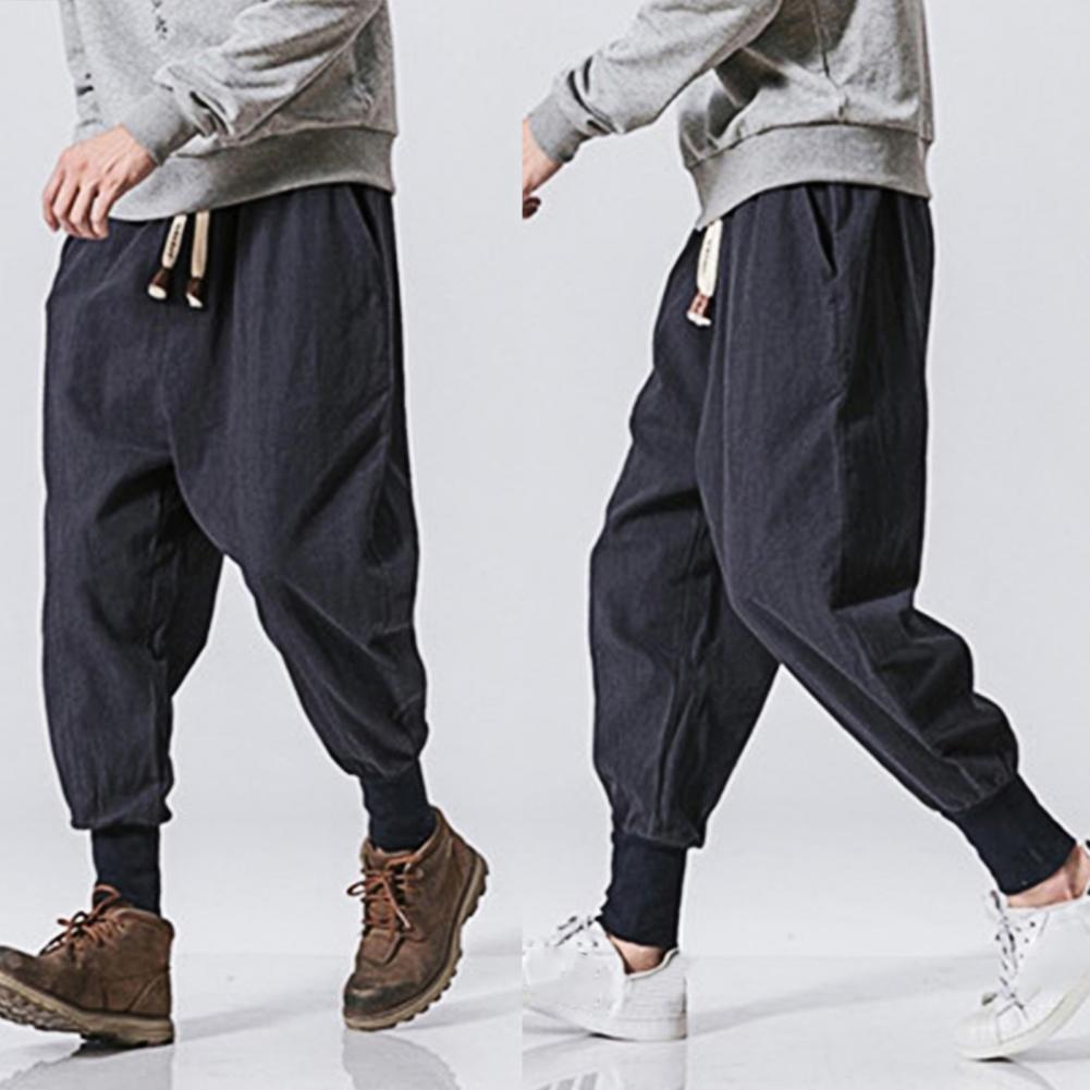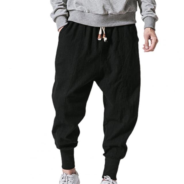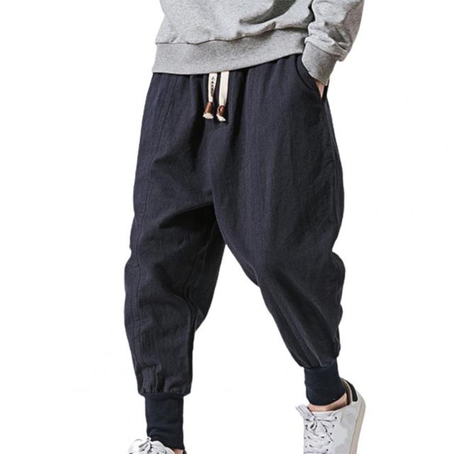 - Available in three colors, each pair features a drawstring waistband and drop-crotch pockets.