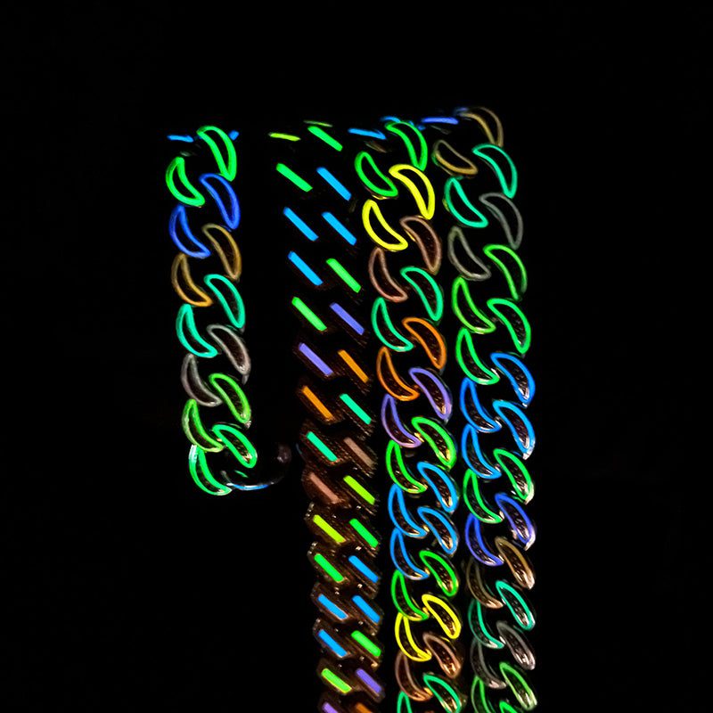 Experience the beauty of our Glow In The Dark Cuban Link Chain. Durable and stylish, this glow in the dark chain is the perfect accessory for any outfit. Crafted from stainless steel, it's designed to last with a corrosion resistant finish. Light up any night with this unique chain.
