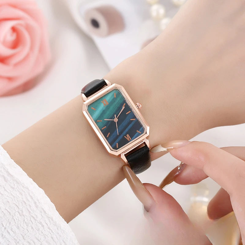 Timeless Malachite Stone Inspired Dial Leather Strap Square Women's Watch