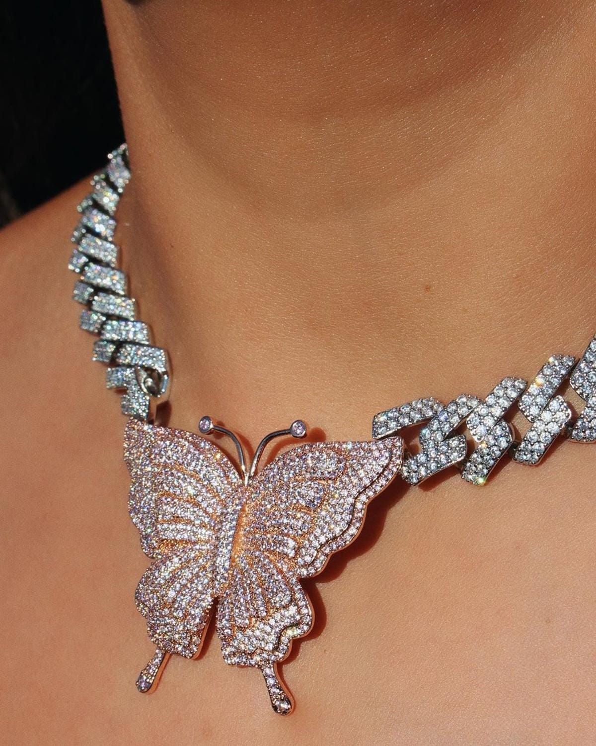 VVS Jewelry Pink Silver Butterfly Miami Cuban Choker